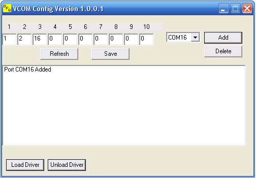 VCOMConfig displays the currently defined Virtual COM ports (either permanent or dynamically defined). Ports may be added or deleted by selecting the COM port from the drop-down list, and clicking "Add" or "Delete".