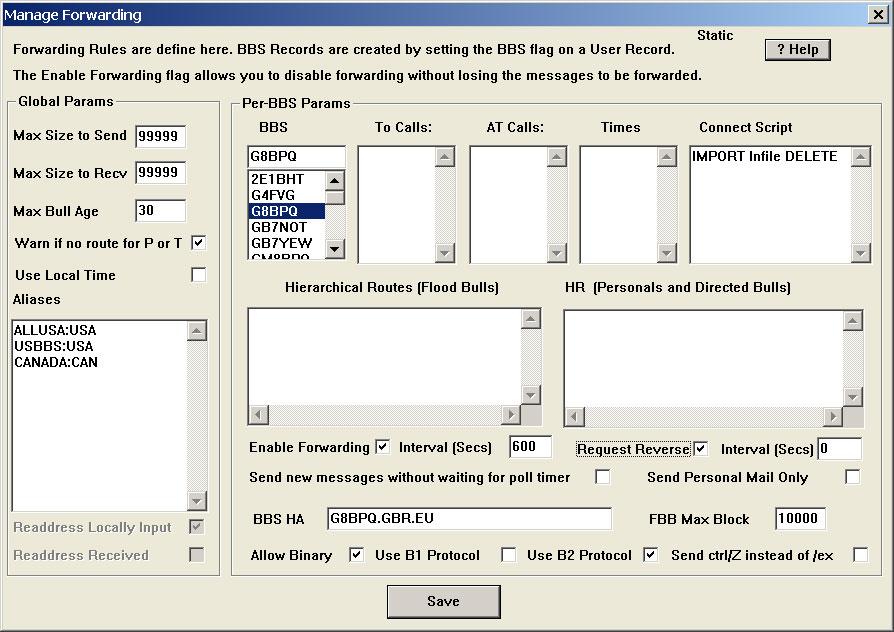 Normally Export would be controlled by a dummy BBS set up for the purpose, eg FILE. Import could use the forwarding record for your BBS Call,