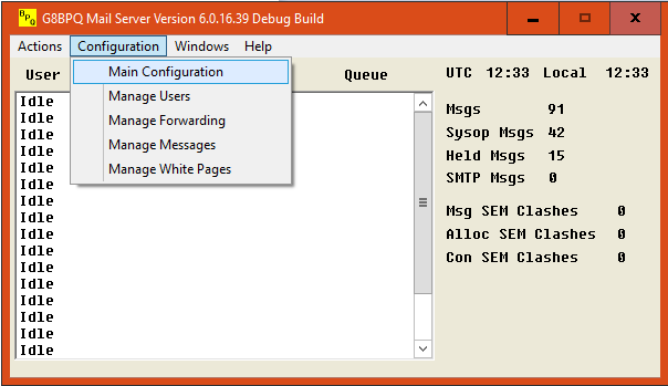 From here you can enter the main Configuration Dialogs, or manage Users, Forwarding, Messages and WP entries.