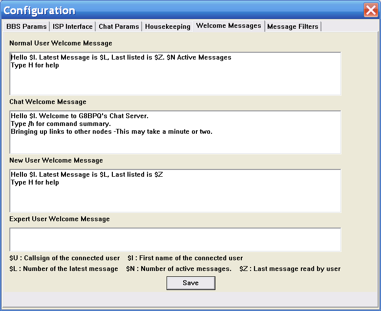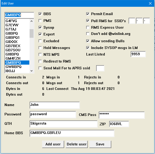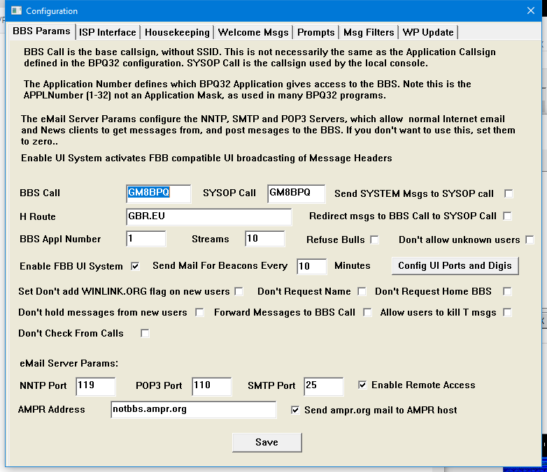 Most other paramters are self explanarory, but "Forward Messages to BBS Call" may not be. Normally a message addressed to the BBS callsign is not queued for forwarding (as it is already where it is supposed to be). But some users have a PMS system with the same callsign and want messages to be sent to it. This parameter enables this to happen.