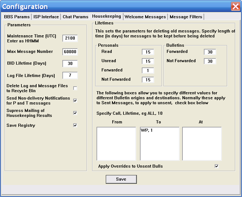 If the "Save Registry" flag is set, the BPQMailChat configuration from the Registry is saved each time Housekeeping is run.