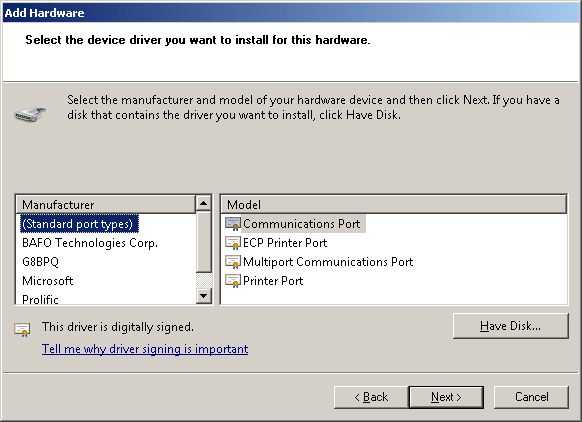 When you install the first device, you need to select "Have Disk". If you want to install more ports,