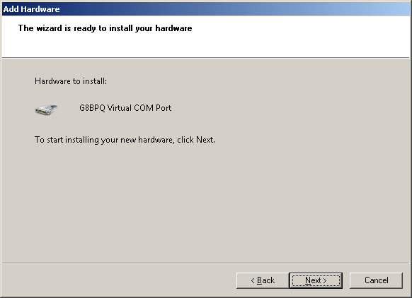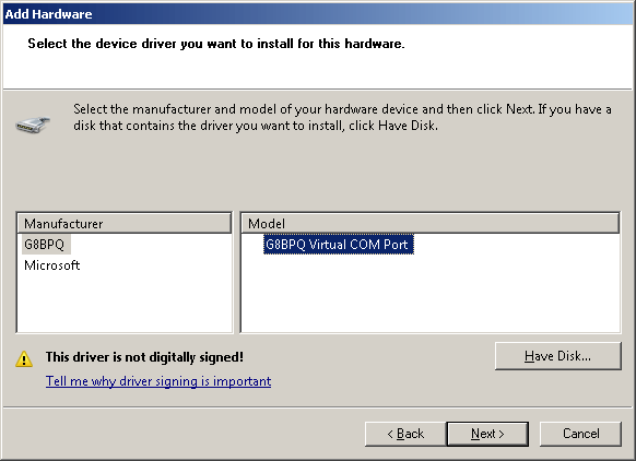 Installation of G8BPQ User Mode Virtual Serial Port Driver on Windows 7 and above